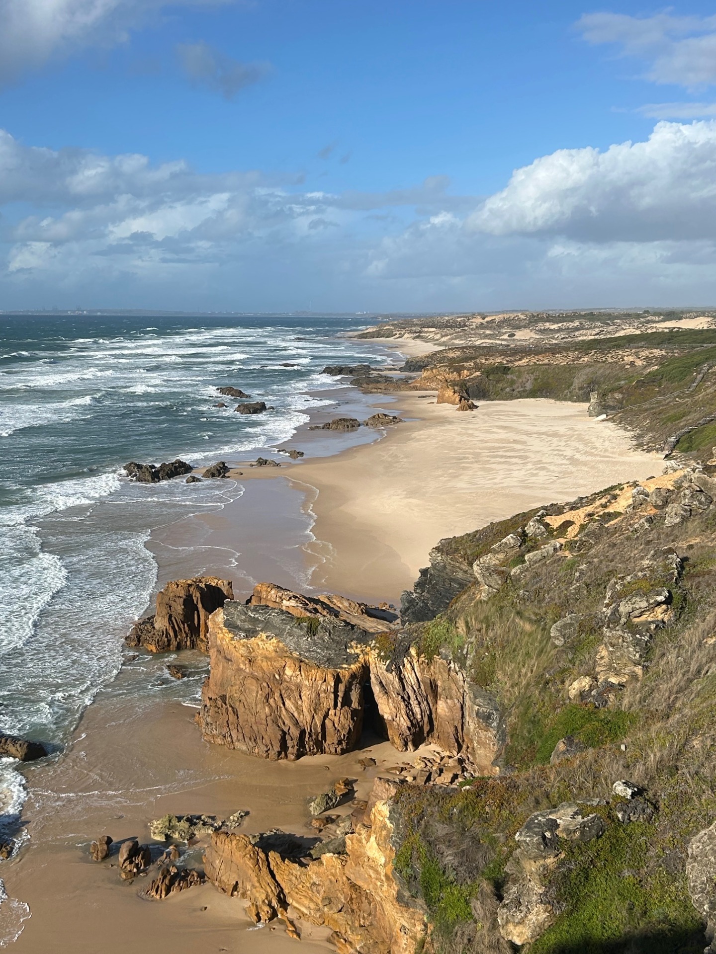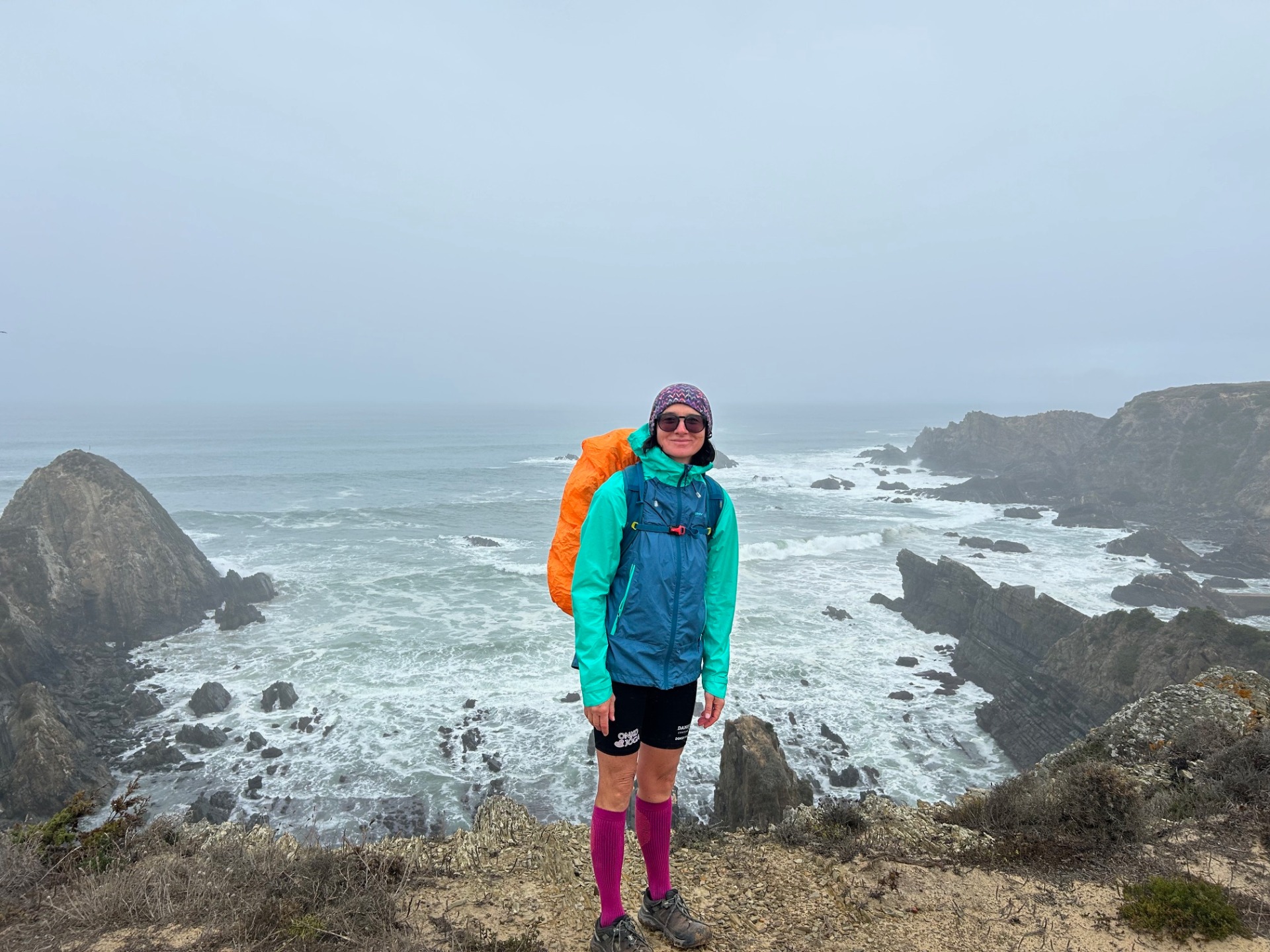 Ubytko bylo včetně snídaně, óóó to je více než příjemné. Od rána ale prší, takový ten jemňouký deštík, který vleze úplně všude. Musím obejít řeku Rio Seixe, kdyby se řeka dala přebrodit, ušetřila bych si dlouhých 8 km po asfaltu. Dneska je to mentálně náročnější, téměř celou cestu prší, bořím se v dunách, bolí mě nohy od puchýřů, který mě trápí již několikátý den. Ale ty výhledy i přesto, že je zataženo a bouření oceánu, za tu dřinu a nepohodlí stojí. Také bylo pár strmých úseků po kamenech. Ta jedna trekovka mě dneska hodně zachraňovala. Krátce před Zambujeira do Mar nádherná pláž, ale dneska nějak nemám energii se šplhat dolů, i když oceán by unaveným nožkám pomohl. Ke konci cesty se i malinko klube sluníčko, tak do cíle dnešní etapy se jde opět zvesela.