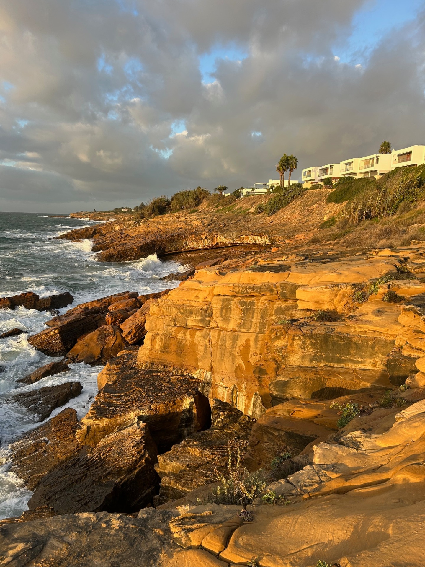 Dle předpovědi platí žlutá výstraha pro oblast Faro (jižní Algarve) kvůli dešti, větru a mořským vlnám,zejména v odpoledních hodinách. Vyrážím ještě za tmy před 7 hodinou ráno. Ani obchod nestíhám, snídaně počká. Počasí vypadá milosrdně, barvy dnešního rána jsou úchvatné, východ slunce odrážející se do barevných skal a útesů. Je znát, že oceán je divočejší než minulé dny, ale nic extra dramatického. V Burgau zvládám rychlý nákup v obchodě a dokonce ranní kávu se sladkým šnekem. Rybářskou vesničku Burgau označují místní jako portugalské Santorini, bílé domky zasazené na útesu. Na místní pláži je znát, že i vítr má obrovskou sílu. Vymotávám se z vesničky a pokračují dále po Rybářské stezce až do Salemy
